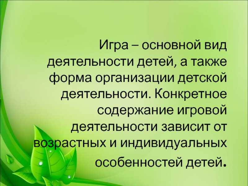 деятельности. Конкретное содержание игровой деятельности зависит от возрастных и индивидуальных особенностей детей.