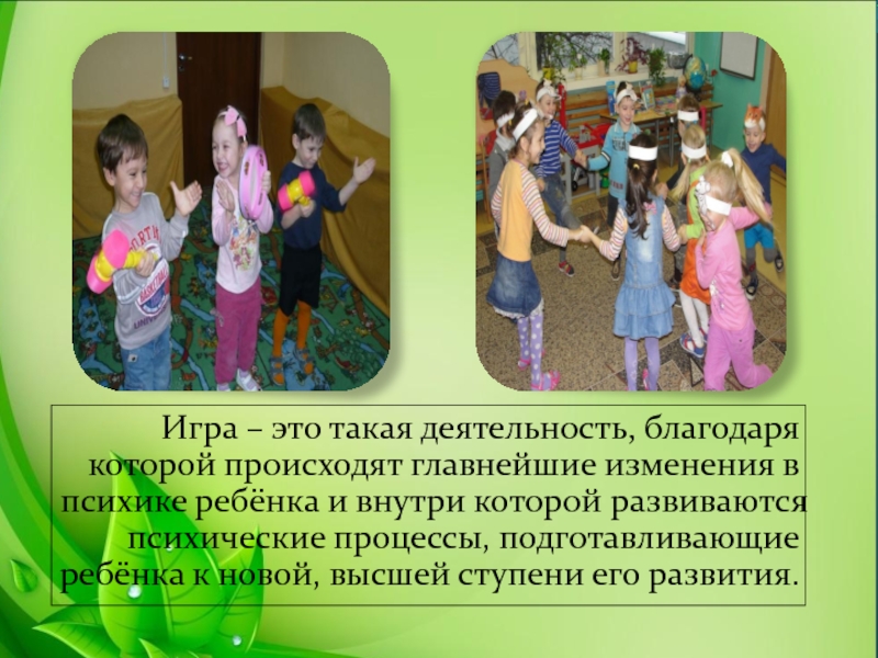 Слайд 2Игра – это такая деятельность, благодаря которой происходят главнейшие изменения в