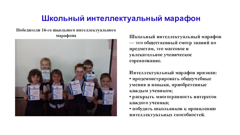 Школьный интеллектуальный марафон — это общественный смотр знаний по предметам, это массовое и увлекательное ученическое соревнование.