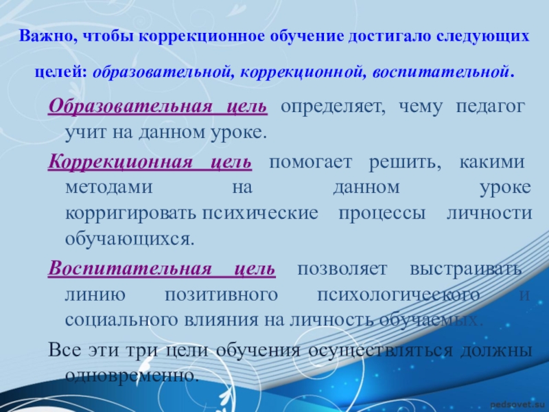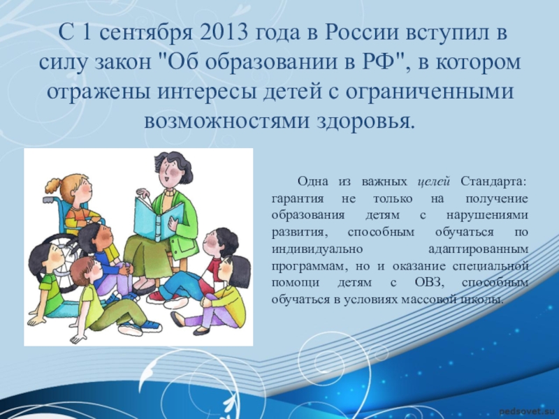 Одна из важных целей Стандарта: гарантия не только на получение образования детям с нарушениями развития, способным обучаться по индивидуально адаптированным программам, но и оказание специальной помощи детям с ОВЗ, способным обучаться в условиях массовой школы.