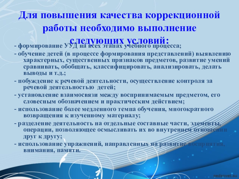 Принцип развития и коррекции высших психических функций предполагает организацию обучения таким образом, чтобы в ходе каждого занятия упражнялись и развивались различные психические процессы обучающихся: мышление, внимание, память и речь.