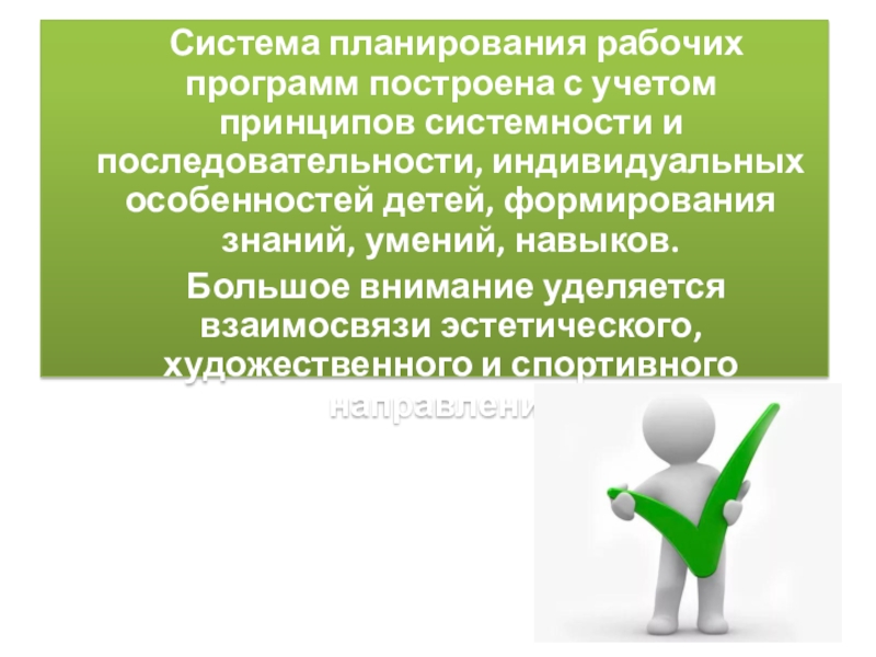 Система планирования рабочих программ построена с учетом принципов системности и последовательности, индивидуальных особенностей детей, формирования знаний, умений, навыков. Большое внимание уделяется взаимосвязи эстетического, художественного и спортивного направлений.