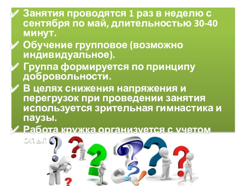 Слайд 4Занятия проводятся 1 раз в неделю с сентября по май, длительностью