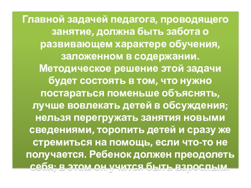 Слайд 6Главной задачей педагога, проводящего занятие, должна быть забота о развивающем характере