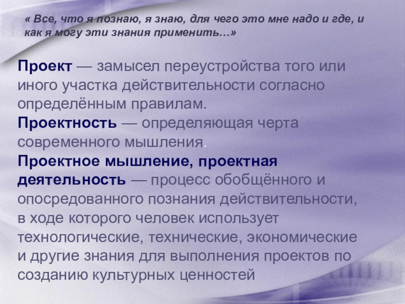 Проектное мышление, проектная деятельность — процесс обобщённого и опосредованного познания действительности, в ходе которого человек использует технологические, технические, экономические и другие знания для выполнения проектов по созданию культурных ценностей