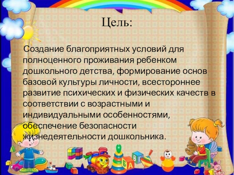 формирование основ базовой культуры личности, всестороннее развитие психических и физических качеств в соответствии с возрастными и индивидуальными особенностями, обеспечение безопасности жизнедеятельности дошкольника.