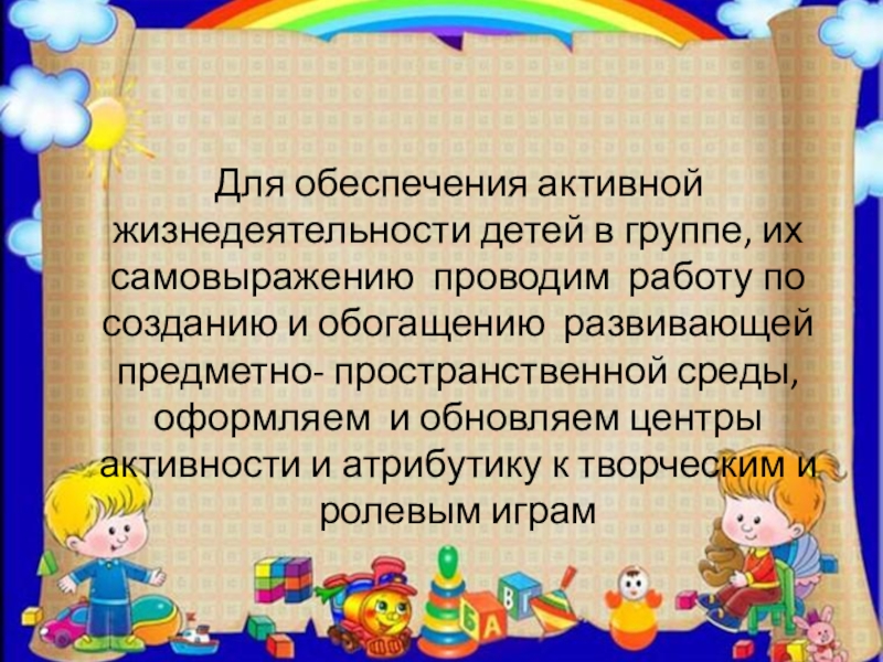 Слайд 14 Для обеспечения активной жизнедеятельности детей в группе, их самовыражению