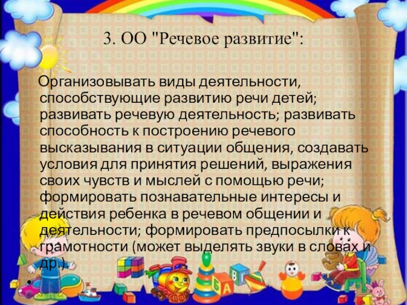 детей; развивать речевую деятельность; развивать способность к построению речевого высказывания в ситуации общения, создавать условия для принятия решений, выражения своих чувств и мыслей с помощью речи; формировать познавательные интересы и действия ребенка в речевом общении и деятельности; формировать предпосылки к грамотности (может выделять звуки в словах и др.).