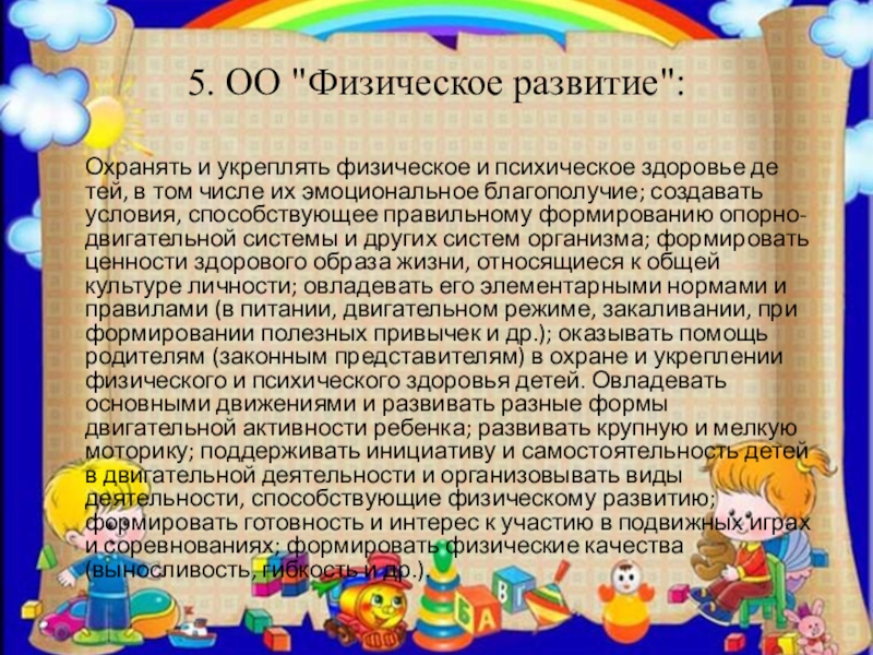 психическое здоровье детей, в том числе их эмоциональное благополучие; создавать условия, способствующее правильному формированию опорно-двигательной системы и других систем организма; формировать ценности здорового образа жизни, относящиеся к общей культуре личности; овладевать его элементарными нормами и правилами (в питании, двигательном режиме, закаливании, при формировании полезных привычек и др.); оказывать помощь родителям (законным представителям) в охране и укреплении физического и психического здоровья детей. Овладевать основными движениями и развивать разные формы двигательной активности ребенка; развивать крупную и мелкую моторику; поддерживать инициативу и самостоятельность детей в двигательной деятельности и организовывать виды деятельности, способствующие физическому развитию; формировать готовность и интерес к участию в подвижных играх и соревнованиях; формировать физические качества (выносливость, гибкость и др.).