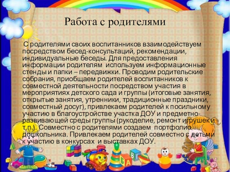 посредством бесед-консультаций, рекомендации, индивидуальные беседы. Для предоставления информации родителям используем информационные стенды и папки – передвижки. Проводим родительские собрания, приобщаем родителей воспитанников к совместной деятельности посредством участия в мероприятиях детского сада и группы (итоговые занятия, открытые занятия, утренники, традиционные праздники, совместный досуг), привлекаем родителей к посильному участию в благоустройстве участка ДОУ и предметно-развивающей среды группы (рукоделие, ремонт игрушек и т.п.). Совместно с родителями создаем портфолио дошкольника. Привлекаем родителей совместно с детьми к участию в конкурсах и выставках ДОУ.