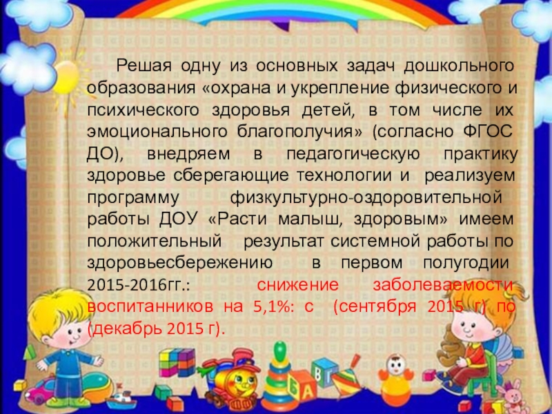 и укрепление физического и психического здоровья детей, в том числе их эмоционального благополучия» (согласно ФГОС ДО), внедряем в педагогическую практику здоровье сберегающие технологии и реализуем программу физкультурно-оздоровительной работы ДОУ «Расти малыш, здоровым» имеем положительный результат системной работы по здоровьесбережению в первом полугодии 2015-2016гг.: снижение заболеваемости воспитанников на 5,1%: с (сентября 2015 г) по (декабрь 2015 г).