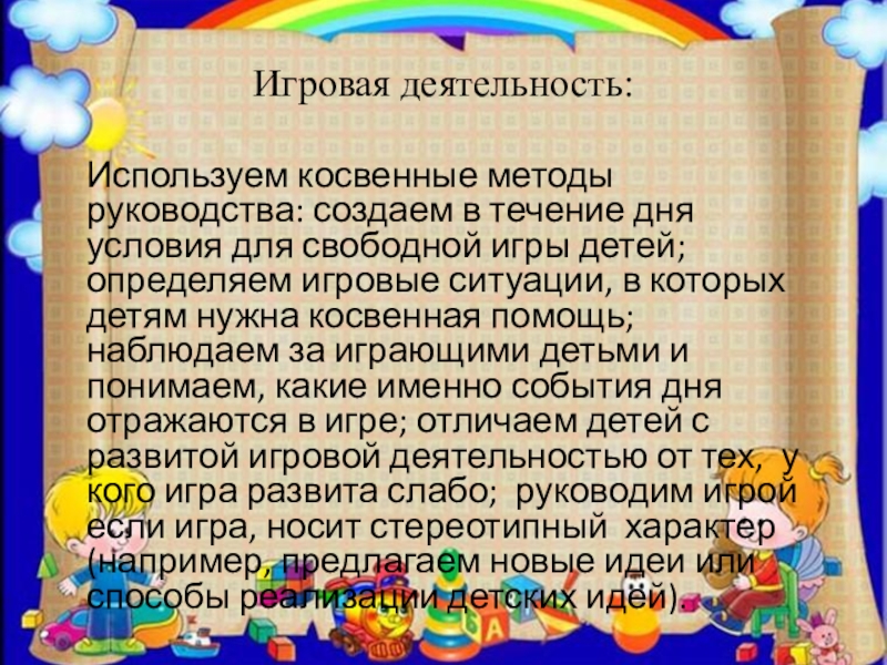 дня условия для свободной игры детей; определяем игровые ситуации, в которых детям нужна косвенная помощь; наблюдаем за играющими детьми и понимаем, какие именно события дня отражаются в игре; отличаем детей с развитой игровой деятельностью от тех, у кого игра развита слабо; руководим игрой если игра, носит стереотипный характер (например, предлагаем новые идеи или способы реализации детских идей).