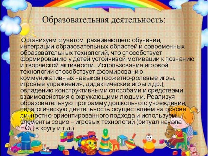 образовательных областей и современных образовательных технологий, что способствует формированию у детей устойчивой мотивации к познанию и творческой активности. Использование игровой технологии способствует формированию коммуникативных навыков (сюжетно-ролевые игры, игровые упражнения, дидактические игры и др.), овладению конструктивными способами и средствами взаимодействия с окружающими людьми. Реализуя образовательную программу дошкольного учреждения, педагогическую деятельность осуществляем на основе личностно-ориентированного подхода и используем элементы социо – игровых технологий (ритуал начала НОД в кругу и т.д.)