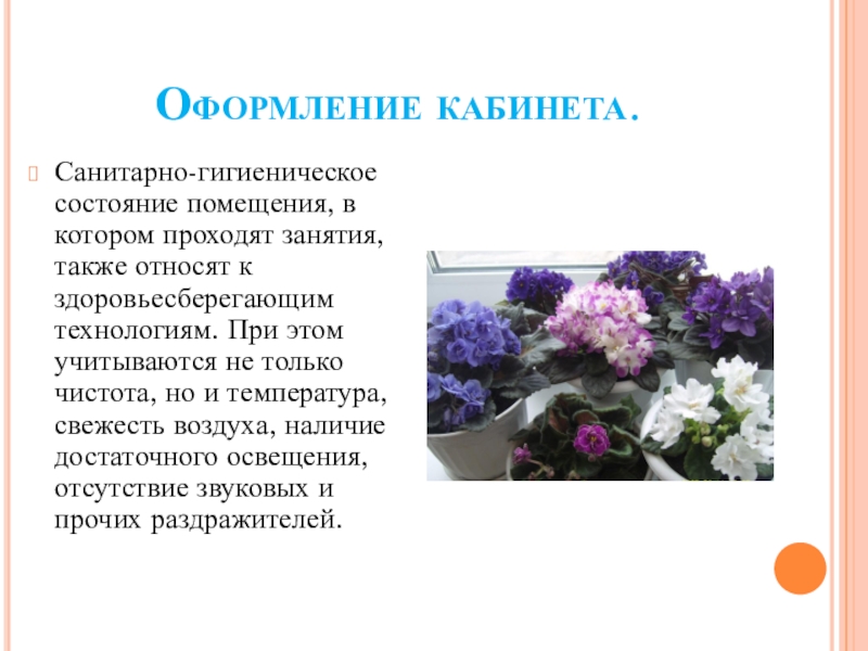 к здоровьесберегающим технологиям. При этом учитываются не только чистота, но и температура, свежесть воздуха, наличие достаточного освещения, отсутствие звуковых и прочих раздражителей.