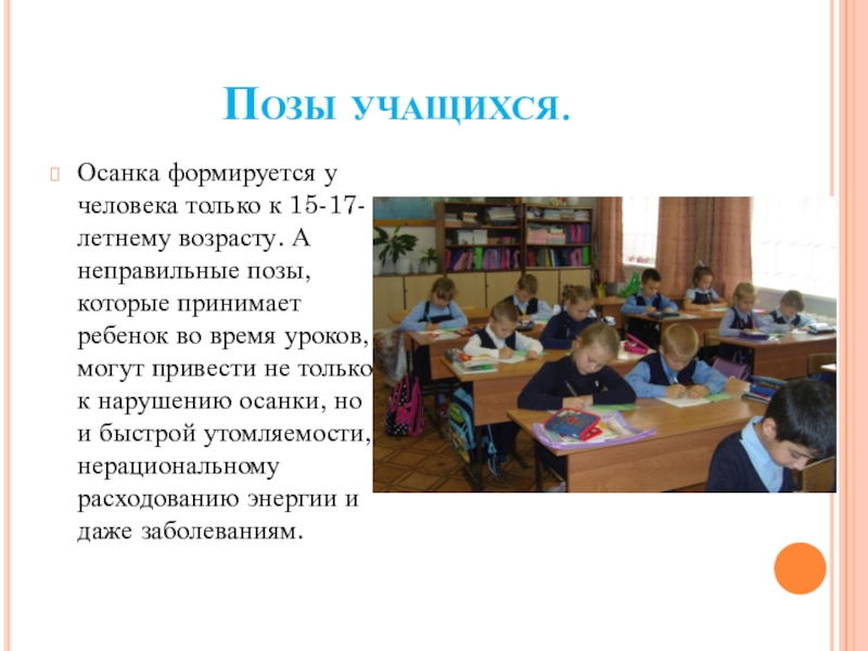 неправильные позы, которые принимает ребенок во время уроков, могут привести не только к нарушению осанки, но и быстрой утомляемости, нерациональному расходованию энергии и даже заболеваниям.