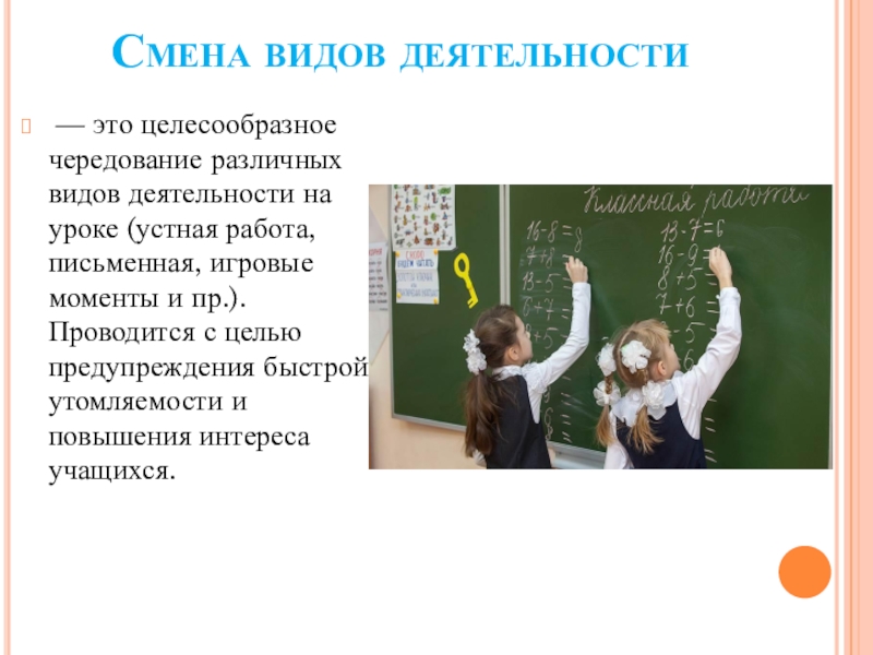 (устная работа, письменная, игровые моменты и пр.). Проводится с целью предупреждения быстрой утомляемости и повышения интереса учащихся.