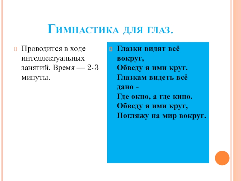 — проводится во время интеллектуальных занятий для снятия напряжения или подготовки