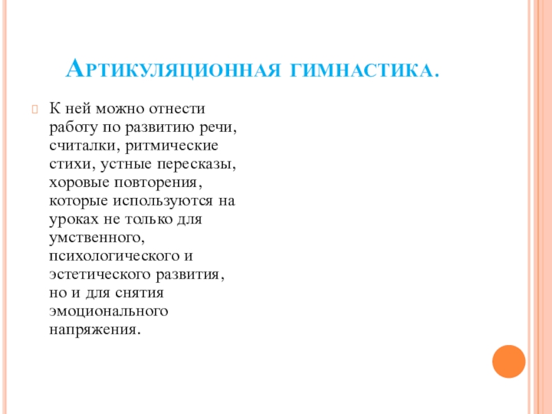 стихи, устные пересказы, хоровые повторения, которые используются на уроках не только для умственного, психологического и эстетического развития, но и для снятия эмоционального напряжения.