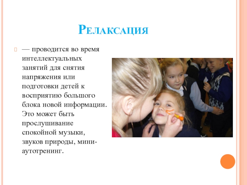 детей к восприятию большого блока новой информации. Это может быть прослушивание спокойной музыки, звуков природы, мини-аутотренинг.