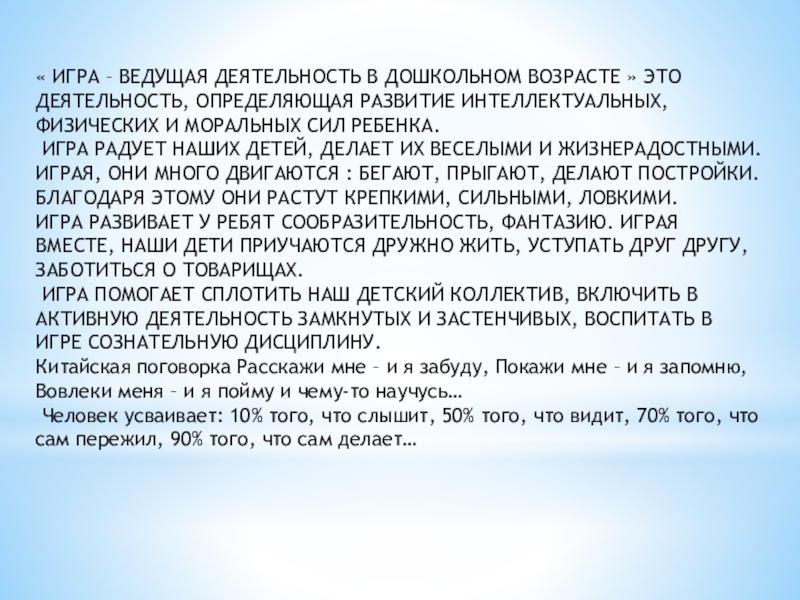 Слайд 7« ИГРА – ВЕДУЩАЯ ДЕЯТЕЛЬНОСТЬ В ДОШКОЛЬНОМ ВОЗРАСТЕ » ЭТО ДЕЯТЕЛЬНОСТЬ,