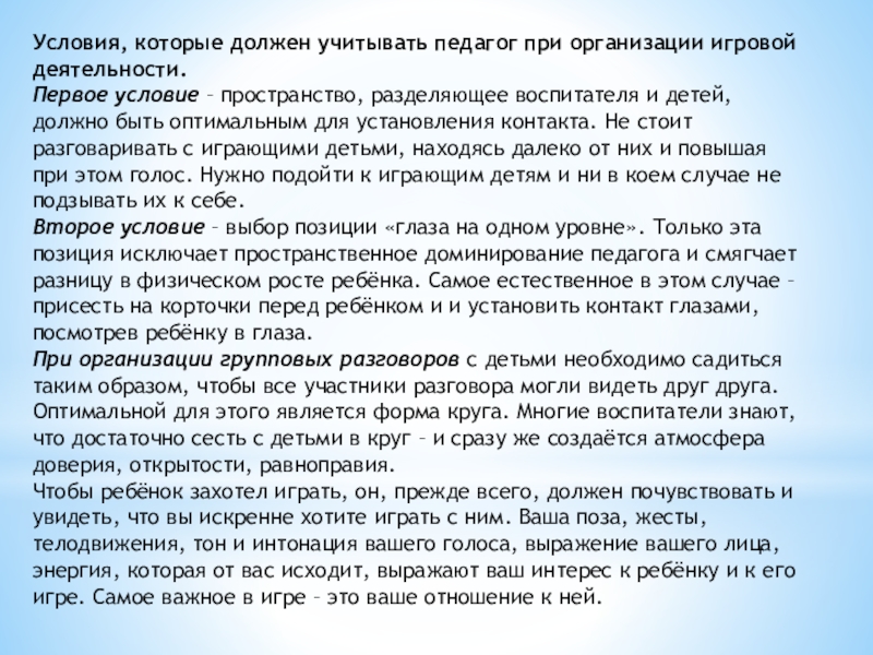 Слайд 10Условия, которые должен учитывать педагог при организации игровой деятельности.