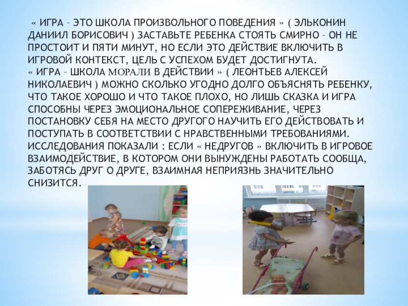 Слайд 6 « ИГРА – ЭТО ШКОЛА ПРОИЗВОЛЬНОГО ПОВЕДЕНИЯ » ( ЭЛЬКОНИН