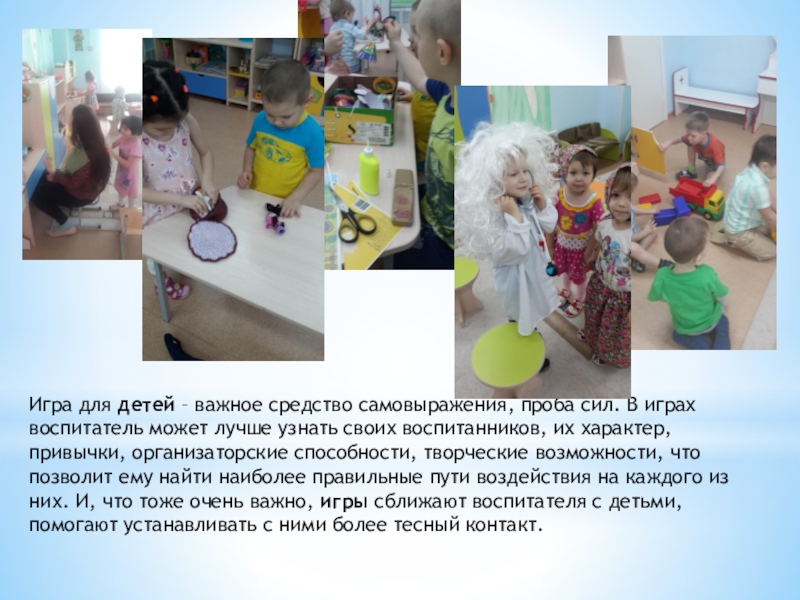 Слайд 12Игра для детей – важное средство самовыражения, проба сил. В играх воспитатель может