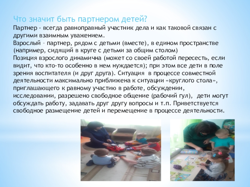 Взрослый – партнер, рядом с детьми (вместе), в едином пространстве (например, сидящий в круге с детьми за общим столом)