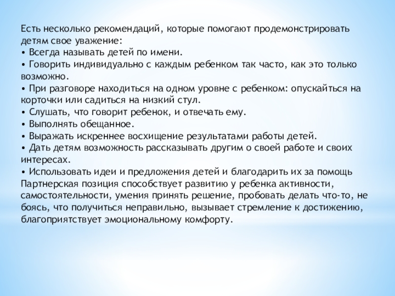 Слайд 4Есть несколько рекомендаций, которые помогают продемонстрировать детям свое уважение: