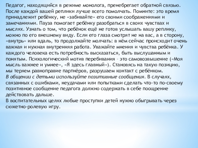 Слайд 11Педагог, находящийся в режиме монолога, пренебрегает обратной связью. После каждой вашей