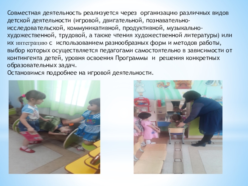 Слайд 5Совместная деятельность реализуется через организацию различных видов детской деятельности (игровой, двигательной,