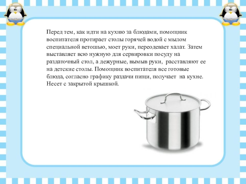 Слайд 4Перед тем, как идти на кухню за блюдами, помощник воспитателя протирает