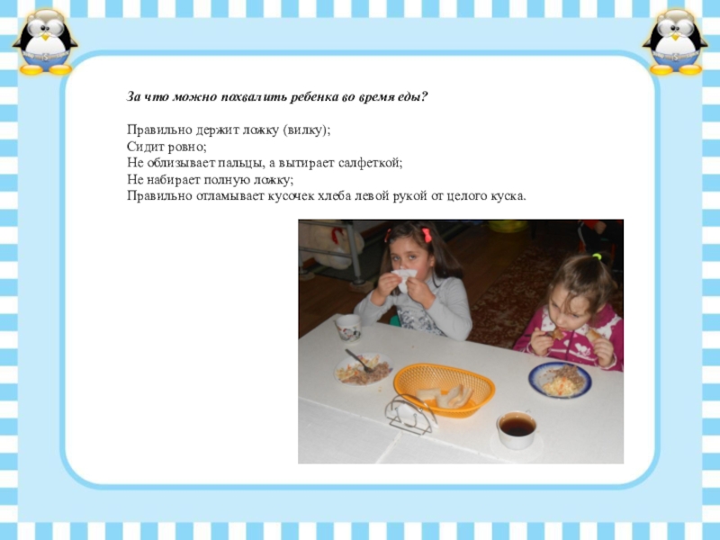 Слайд 18За что можно похвалить ребенка во время еды? Правильно держит ложку