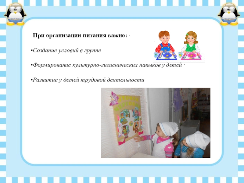 При организации питания важно: ·         Создание условий в группе         Формирование культурно-гигиенических навыков у детей ·    Развитие у