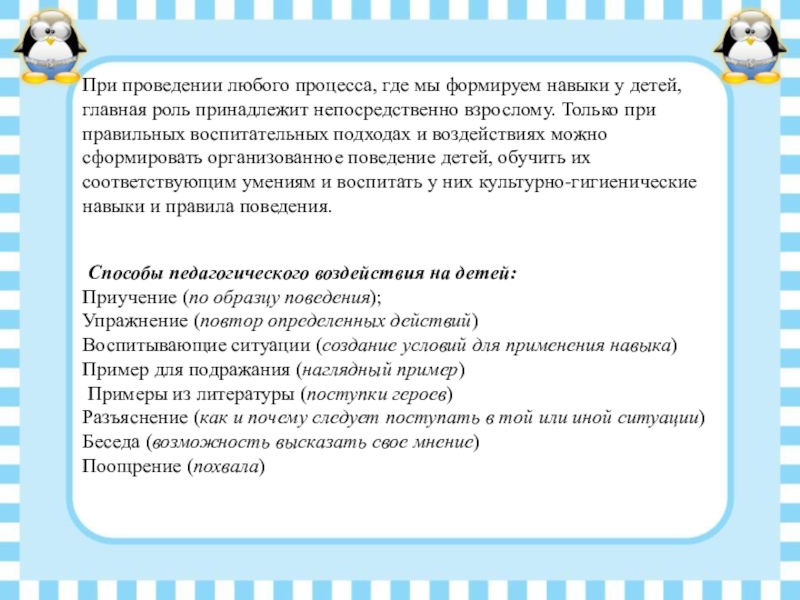роль принадлежит непосредственно взрослому. Только при правильных воспитательных подходах и воздействиях можно сформировать организованное поведение детей, обучить их соответствующим умениям и воспитать у них культурно-гигиенические навыки и правила поведения.