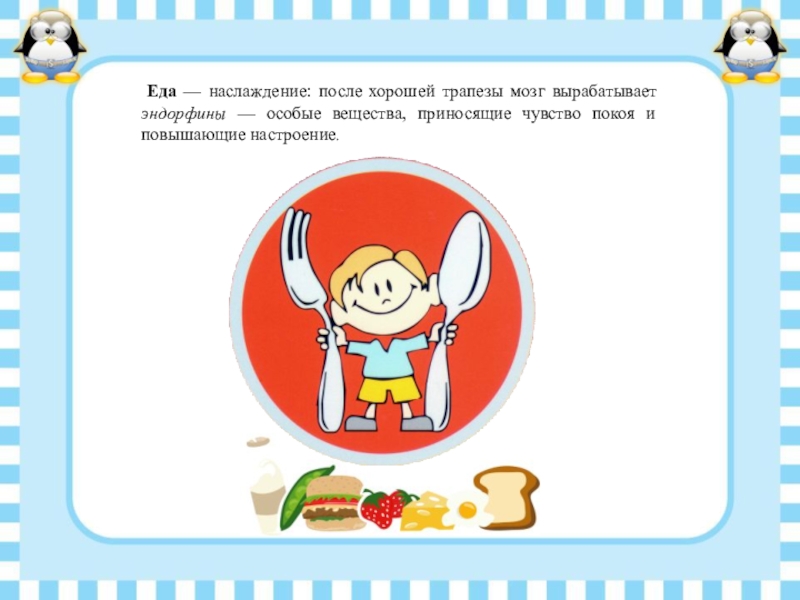 Слайд 2 Еда — наслаждение: после хорошей трапезы мозг вырабатывает эндорфины —