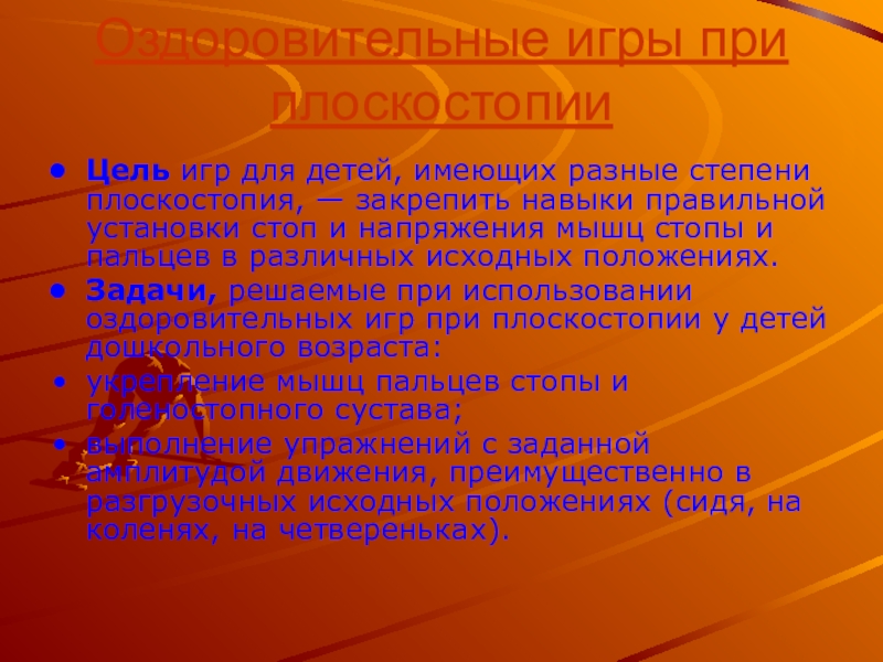 Задачи, решаемые при использовании оздоровительных игр при плоскостопии у детей дошкольного возраста: