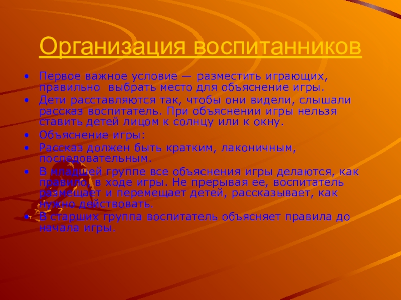 Дети расставляются так, чтобы они видели, слышали рассказ воспитатель. При объяснении игры нельзя ставить детей лицом к солнцу или к окну.