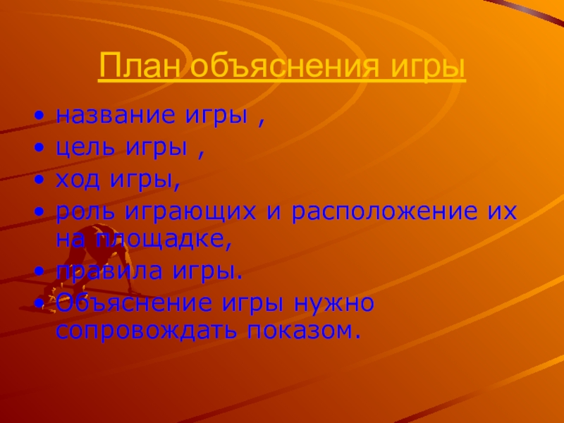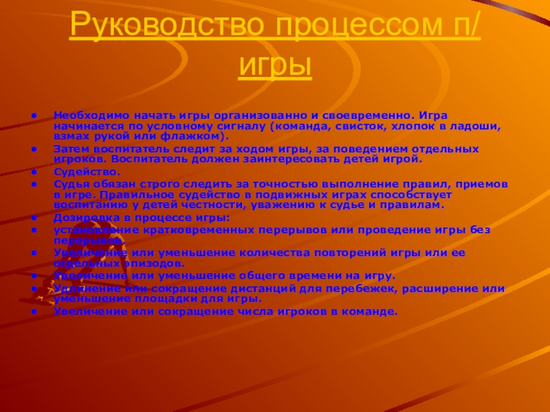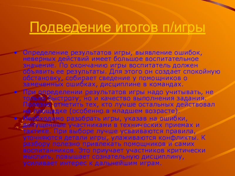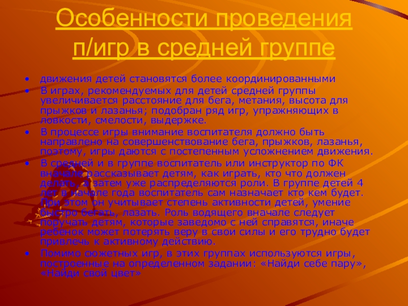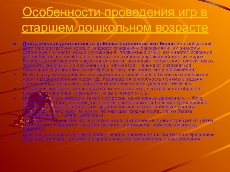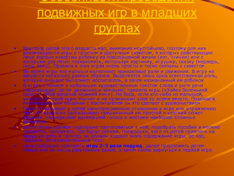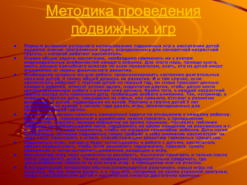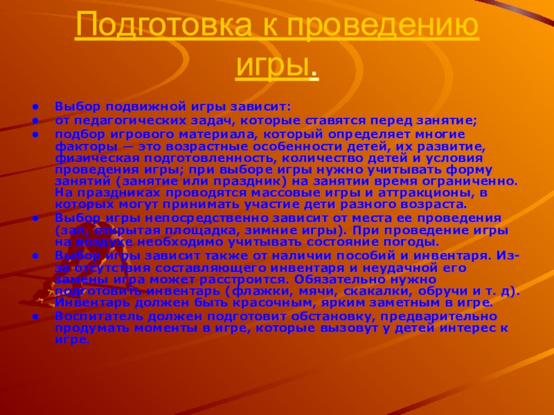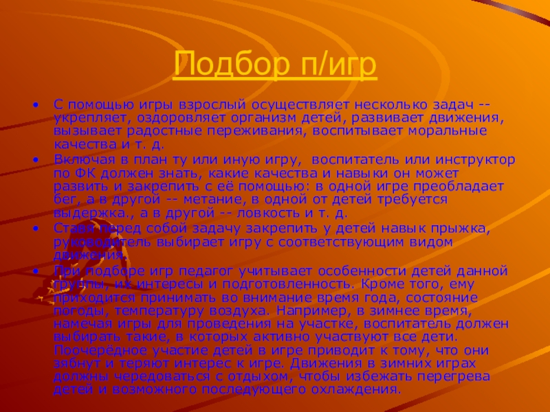 подбор игрового материала, который определяет многие факторы — это возрастные особенности детей, их развитие, физическая подготовленность, количество детей и условия проведения игры; при выборе игры нужно учитывать форму занятий (занятие или праздник) на занятии время ограниченно. На праздниках проводятся массовые игры и аттракционы, в которых могут принимать участие дети разного возраста.