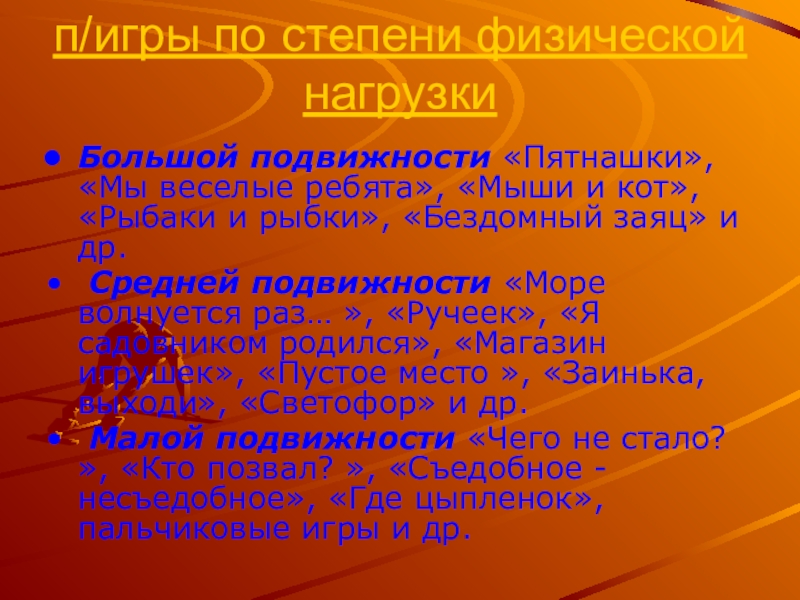 Средней подвижности «Море волнуется раз… », «Ручеек», «Я садовником родился», «Магазин игрушек», «Пустое место », «Заинька, выходи», «Светофор» и др.