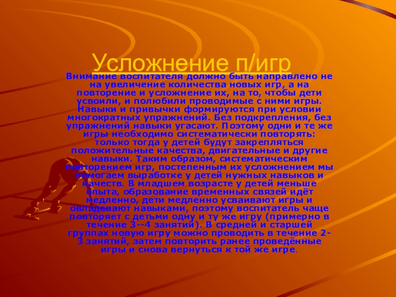игр, а на повторение и усложнение их, на то, чтобы дети усвоили, и полюбили проводимые с ними игры. Навыки и привычки формируются при условии многократных упражнений. Без подкрепления, без упражнений навыки угасают. Поэтому одни и те же игры необходимо систематически повторять: только тогда у детей будут закрепляться положительные качества, двигательные и другие навыки. Таким образом, систематическим повторением игр, постепенным их усложнением мы помогаем выработке у детей нужных навыков и качеств. В младшем возрасте у детей меньше опыта, образование временных связей идёт медленно, дети медленно усваивают игры и овладевают навыками, поэтому воспитатель чаще повторяет с детьми одну и ту же игру (примерно в течение 3--4 занятий). В средней и старшей группах новую игру можно проводить в течение 2- 3 занятий, затем повторить ранее проведённые игры и снова вернуться к той же игре.