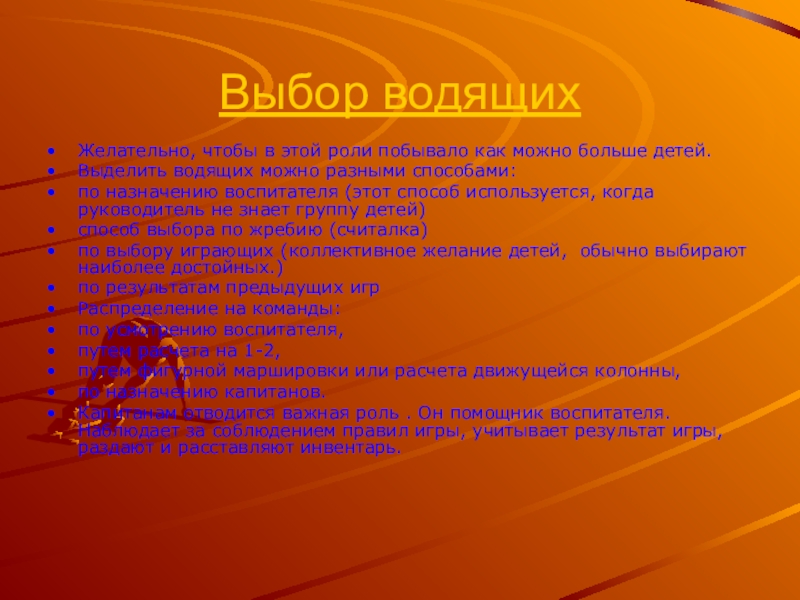 Выбор игры непосредственно зависит от места ее проведения (зал, открытая площадка, зимние игры). При проведение игры на воздухе необходимо учитывать состояние погоды.