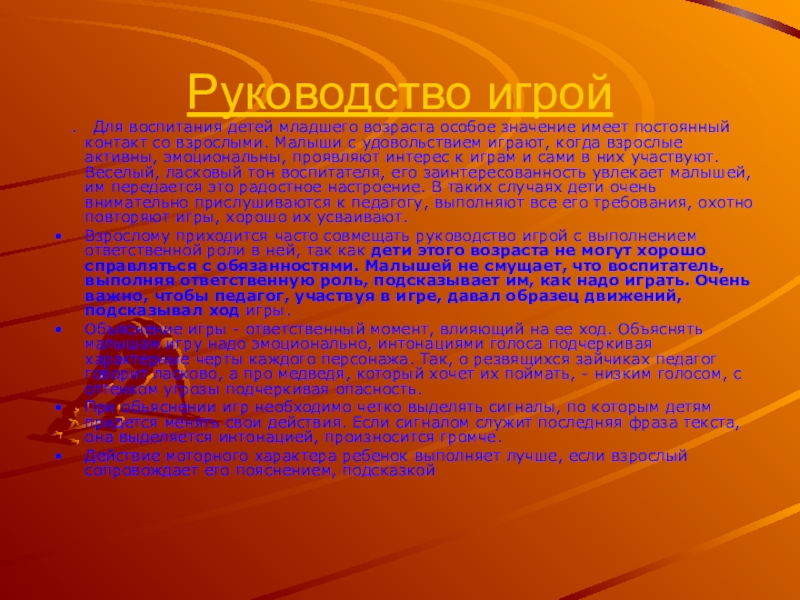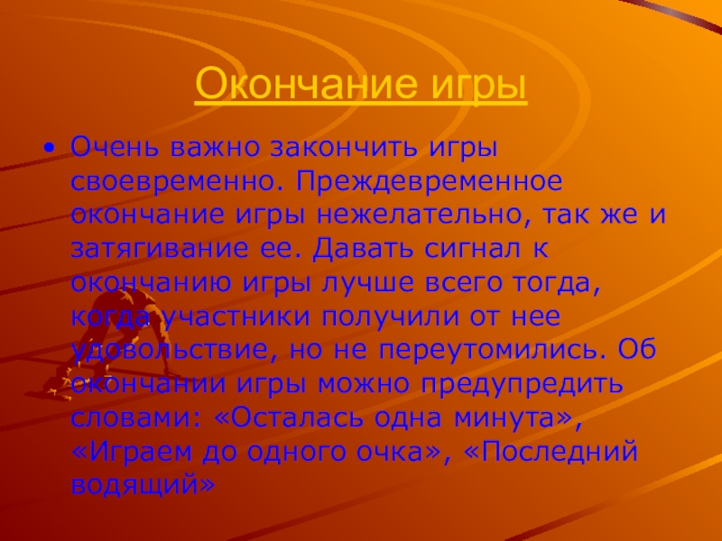 Эти явления нежелательны и указывают на то, что для ребенка проводимая игра — чрезмерная нагрузка. Нужно тут же принять соответствующие меры, например, дать ребенку роль, не требующую большого напряжения — помощника руководителя, «судьи» или временно (конечно, тактично) исключить его из игры.