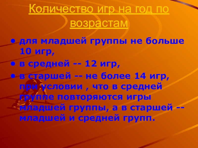 в старшей -- не более 14 игр, при условии , что в средней группе повторяются игры младшей группы, а в старшей -- младшей и средней групп.