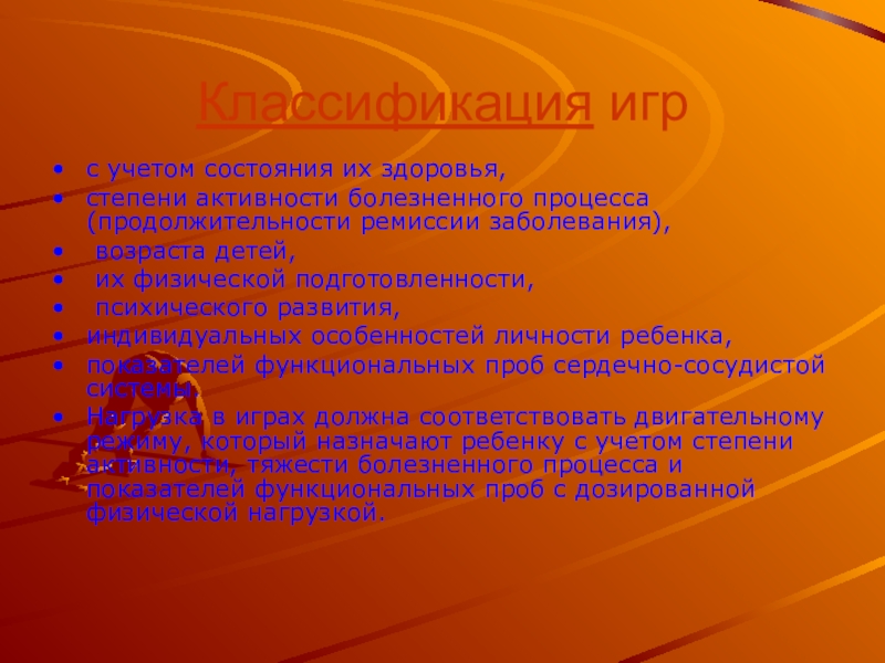 Нагрузка в играх должна соответствовать двигательному режиму, который назначают ребенку с учетом степени активности, тяжести болезненного процесса и показателей функциональных проб с дозированной физической нагрузкой.