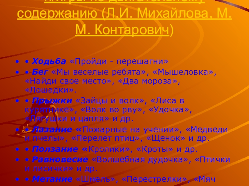 Слайд 5п/игры по двигательному содержанию (Л.И. Михайлова, М.М. Контарович)