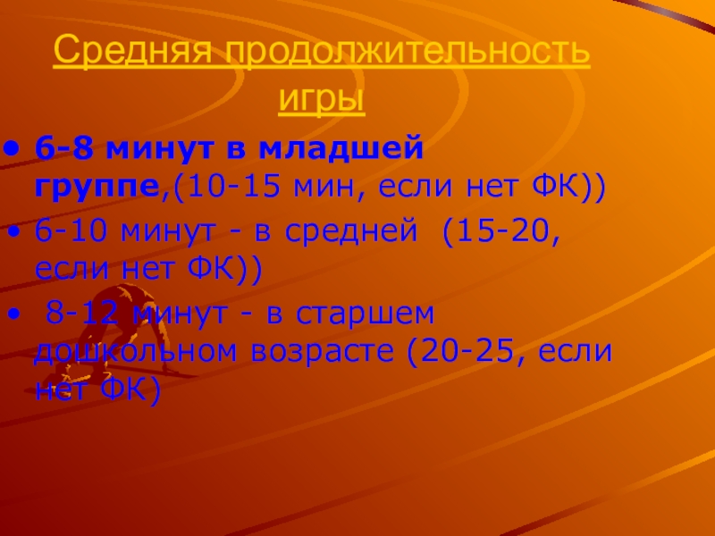 6-8 минут в младшей группе,(10-15 мин, если нет ФК))