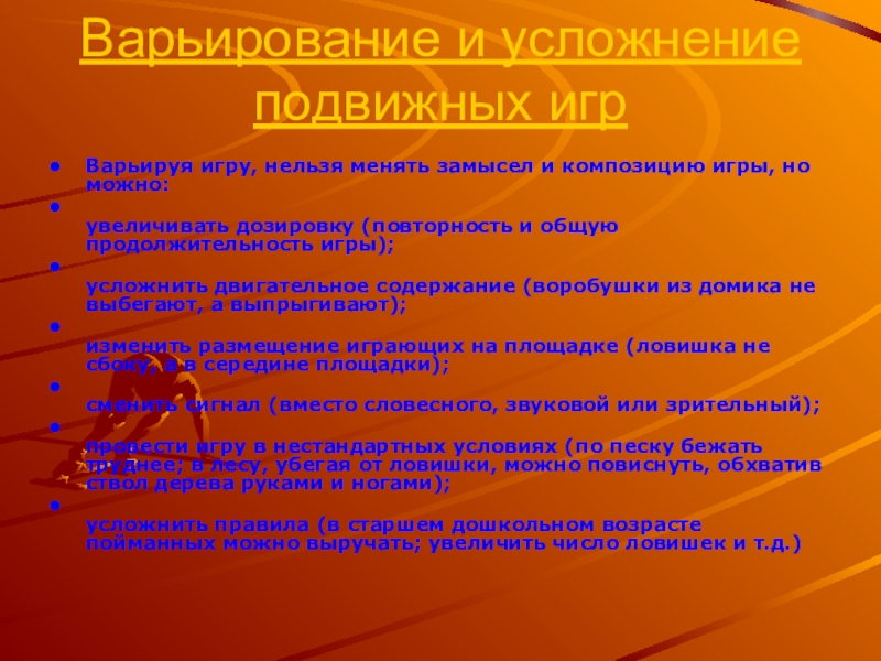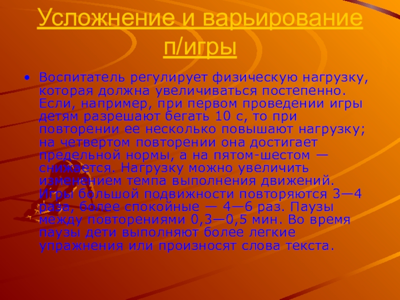 Если, например, при первом проведении игры детям разрешают бегать 10 с, то при повторении ее несколько повышают нагрузку; на четвертом повторении она достигает предельной нормы, а на пятом-шестом — снижается. Нагрузку можно увеличить изменением темпа выполнения движений.