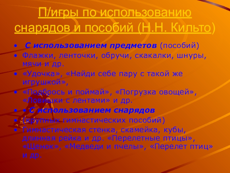 Слайд 6П/игры по использованию снарядов и пособий (Н.Н. Кильто)