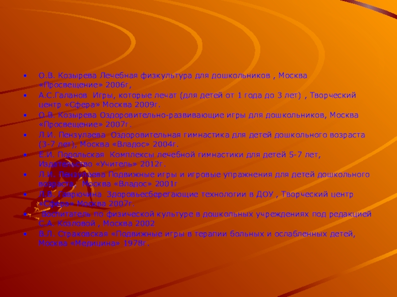 О.В. Козырева Оздоровительно-развивающие игры для дошкольников, Москва «Просвещение» 2007г.